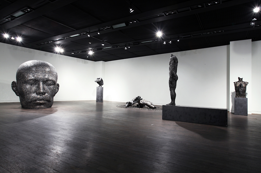 Les sculptures des corps souvent inachevées comme amputés et blessés traduisent la souffrance, l’angoisse et la perte d’identité de la jeune génération. Les visages monumentaux posés sur le sol, portraits dénués d’expression catalysent un sentiment d’horreur inconnu. SOURCE